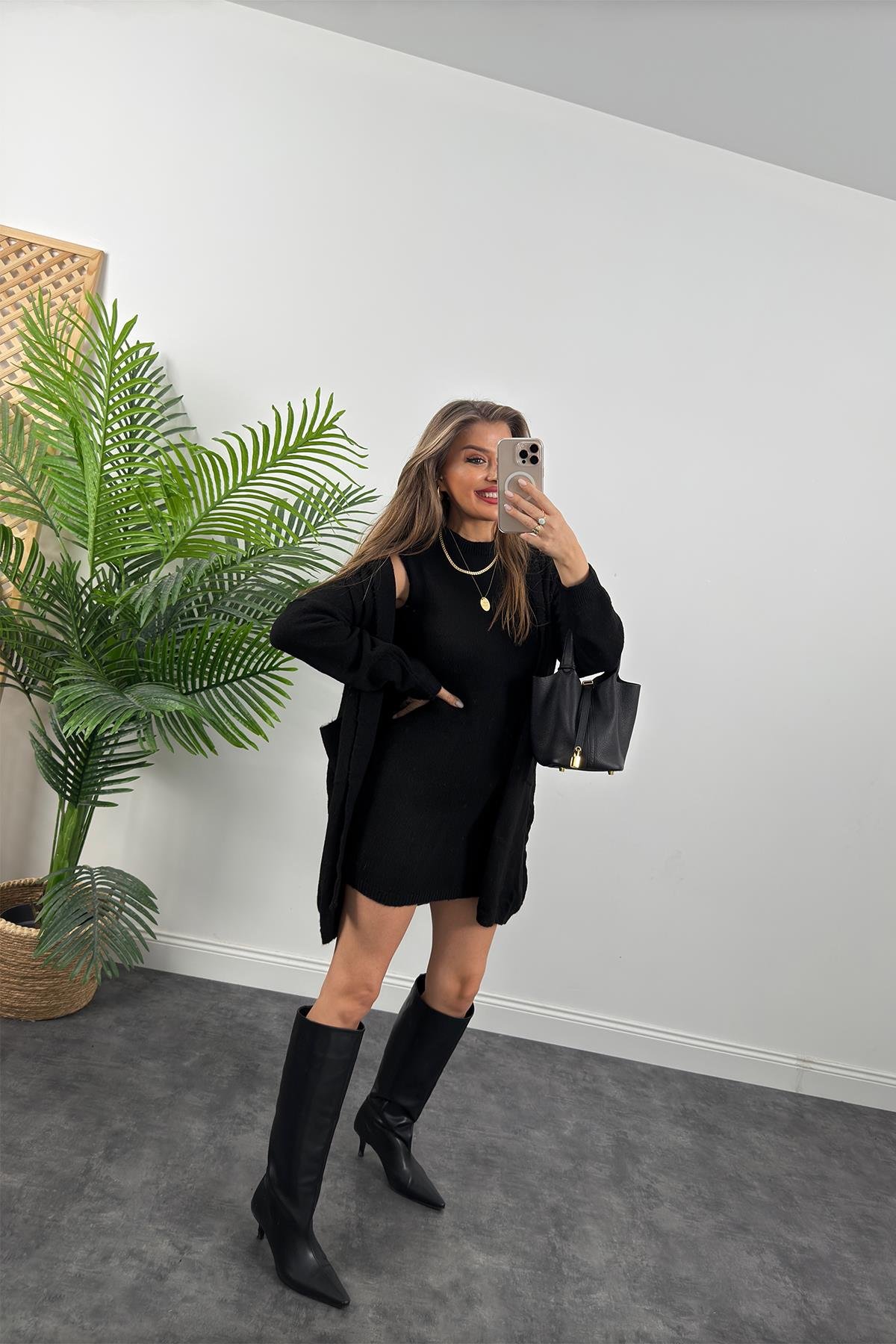 - Kombin, modern ve minimalist bir tarzı yansıtıyor. Siyah mini elbise, diz üstü çizmeler ve uzun hırka, hem rahat hem de şık bir görünüm sağlıyor. Altın kolyeler ise kombine zarif bir detay ekliyor.